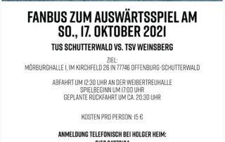 Ausfahrt Herren 1 nach Schutterwald 🚌 Mit dem Fanbus zum Auswärtsspiel am Sonntag, 17.10.2021: Kosten pro Fahrt/Person 15€ Abfahrt: Weibertreuhalle, Rossäckerstraße 19, 74189 Weinsberg Ziel: Mörburghalle 1, D 77746 Schutterwald, Im Kirchfeld 26, Offenburg-Schwarzwald Spielbeginn: [...]